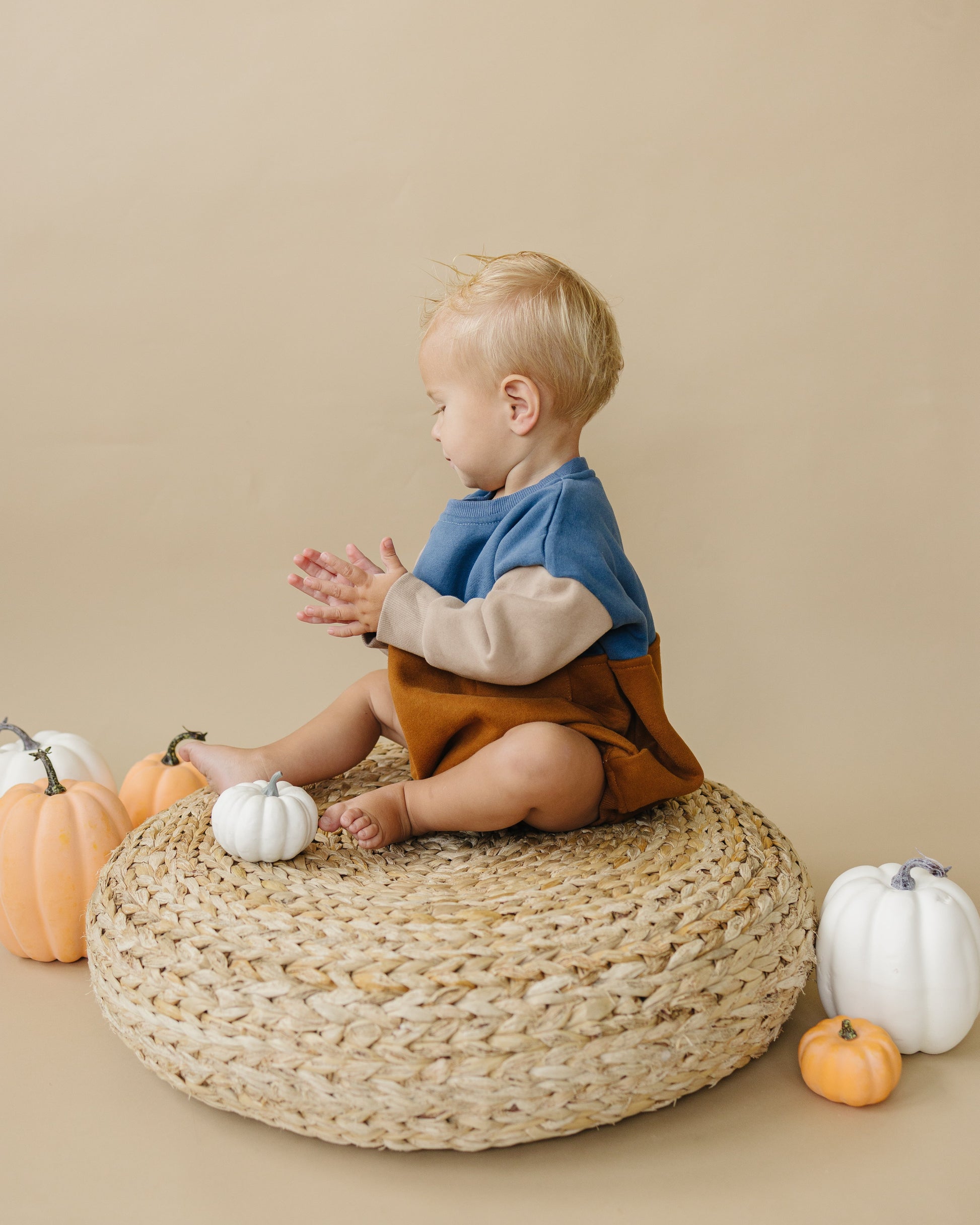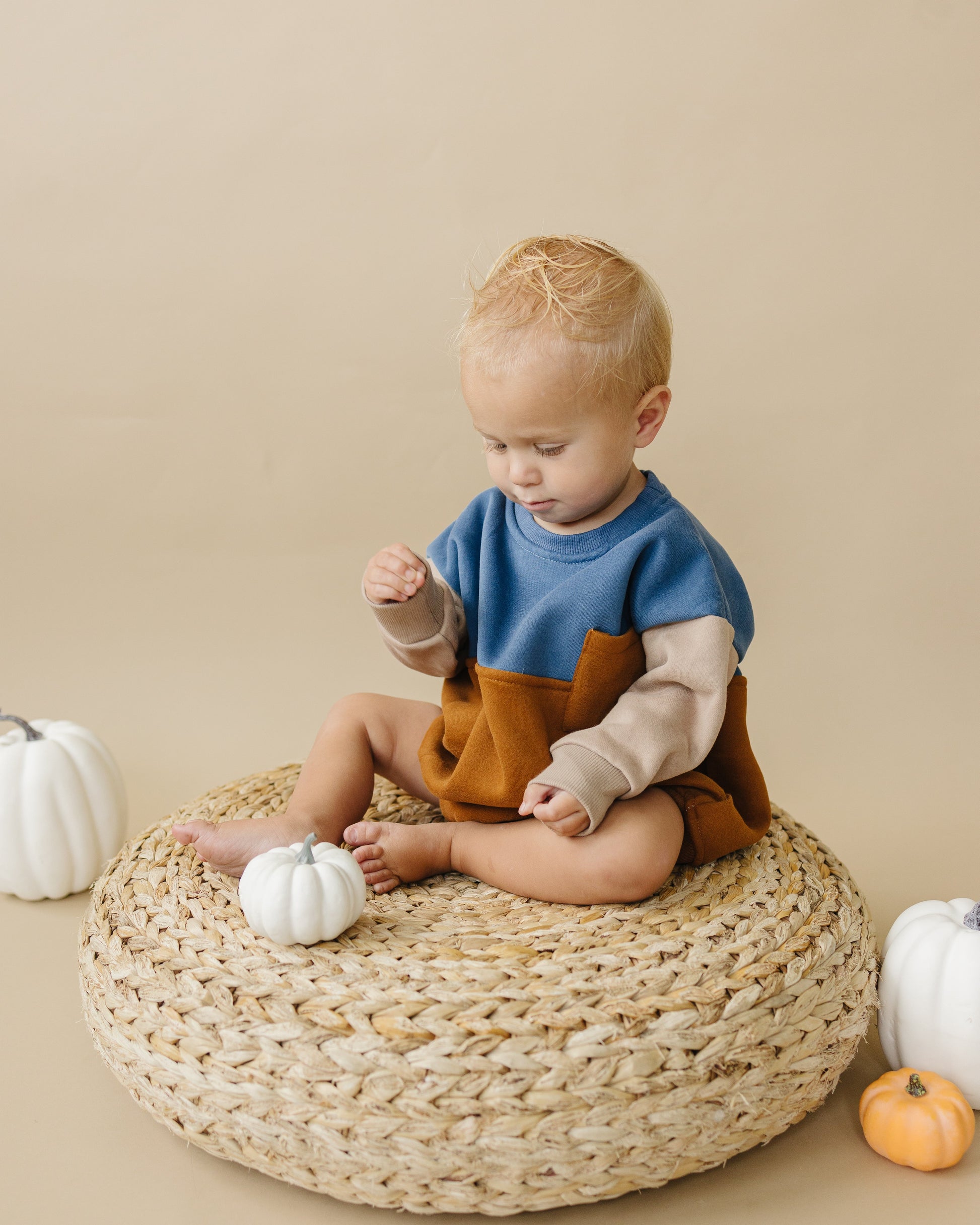 Little Joy Co. x Salt and Pine Color Block Oversized Sweatshirt Romper - Embrace autumn vibes with this cozy and stylish oversized sweatshirt romper. Featuring a convenient snap closure at the crotch, it guarantees easy dressing and diaper changes. The charming fall themed color blocking design ensuring a solid style for boys and girls this fall!Â